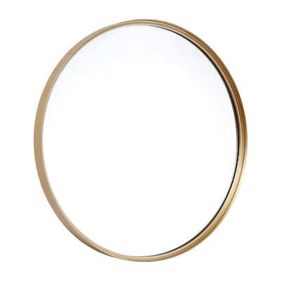 Give any room in your home an instant refresh with this round wall mount mirror. The modern design boasts a 2" deep, matte gold metal frame that lends an up-to-date look to almost any decor. HD glass with real silver backing provides high reflectivity for a distortion-free image. Safety should always be first, especially in environments with children and pets. Shatterproof backing technology ensures the glass stays put in the frame when breakage occurs to prevent cuts. The waterproof and rust-resistant design make this large mirror ideal for use in high humidity areas such as bathrooms, kitchens, and sheltered balconies. Hanging hardware is included for quick and easy installation of your new looking glass and this mirror wipes clean with a damp cloth.
