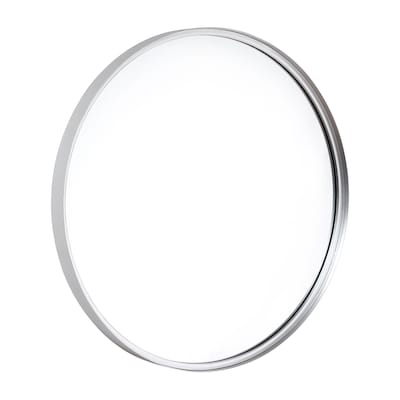 Give any room in your home an instant refresh with this round wall mount mirror. The modern design boasts a 2" deep, matte silver metal frame that lends an up-to-date look to almost any decor. HD glass with real silver backing provides high reflectivity for a distortion-free image. Safety should always be first, especially in environments with children and pets. Shatterproof backing technology ensures the glass stays put in the frame when breakage occurs to prevent cuts. The waterproof and rust-resistant design make this large mirror ideal for use in high humidity areas such as bathrooms, kitchens, and sheltered balconies. Hanging hardware is included for quick and easy installation of your new looking glass and this mirror wipes clean with a damp cloth.