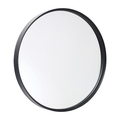 Give any room in your home an instant refresh with this round wall mount mirror. The modern design boasts a 2" deep, matte black metal frame that lends an up-to-date look to almost any decor. HD glass with real silver backing provides high reflectivity for a distortion-free image. Safety should always be first, especially in environments with children and pets. Shatterproof backing technology ensures the glass stays put in the frame when breakage occurs to prevent cuts. The waterproof and rust-resistant design make this large mirror ideal for use in high humidity areas such as bathrooms, kitchens, and sheltered balconies. Hanging hardware is included for quick and easy installation of your new looking glass and this mirror wipes clean with a damp cloth.