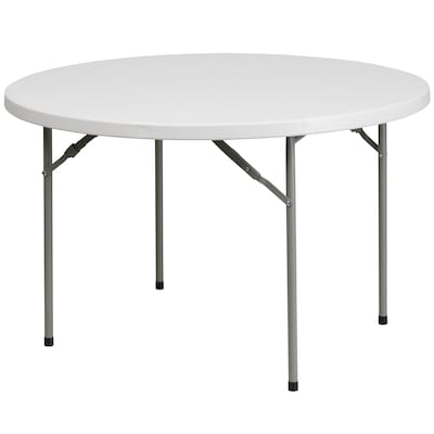 Coordinate game night around this round plastic table to seat 5 - 6 adults to play card games, charades or board games. This plastic folding table can act as your temporary outdoor patio table to host barbecues and pool parties. This foldable table is perfect to entertain on for outdoor events, but it must be stored indoors to protect the frame from extreme moisture. Place this 48-inch round banquet table next to the bride and groom's table in your event hall to hold the wedding cake and card box. Your hard flooring will be kept scratch-free due the floor protecting glides. This table is ready to use and is ideal in banquet halls, convention halls, recreation centers, schools and meeting event spaces.