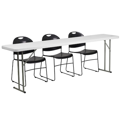 Setup your training room with this 18x96 plastic folding table and ergonomically contoured stack chairs. This 4-piece set will furnish your computer labs, testing rooms and training labs. This table set can be setup as a temporary arrangement due to the folding locking leg mechanisms on the table and stackable plastic chairs. Create a makeshift customer and student intake setup to sign in people before entering the room. The included black plastic stack chairs can hold up to 880 pounds to seat everyone comfortably. Take the guess work out of piecing together a table set for your computer lab or learning center.