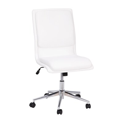 Fabulous form meets practical purpose in the elevated style of this mid-back office task chair. Plush foam padding is enveloped in luxurious LeatherSoft upholstery for an upmarket look in a commercial or home office. LeatherSoft is leather and polyurethane for added softness and durability. The armless design allows this chair to tuck beneath your desk. A solid wood seat and 5-star chrome base give a worry-free seating experience and hold up to 300 lbs. static weight while the 360° swivel feature, along with dual wheel casters, provides excellent mobility. Pneumatic seat height adjustment puts you at the perfect level to keep your feet flat on the floor. Super easy assembly will have your chair ready to go in under 10 minutes and a solvent-based cleaner will keep it looking brand new with no water needed. This swivel task chair is available in multiple colors to match any decor.