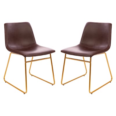 Multipurpose chair ideal as extra seating in the living room, office, or bedroom as well as the dining room Add a touch of understated elegance to your kitchen, dining room, or cafe with this set of 2 dark brown indoor table height chairs. Boasting soft and durable LeatherSoft upholstery paired with a sleek gold base, this bucket style dining room chair lends an upmarket style to your commercial or residential space. The low bentwood back of this short dining room chair supports the lower back region allowing you to linger over meals at home or your patrons to stay a while in your neighborhood restaurant. Featuring a solid iron frame with metal screw reinforcements, this standard height dining chair will be a long-lasting addition to any space. Fixed plastic floor glides will prevent damage to your hard flooring surfaces. Easily clean your new stools with water followed by a dry cloth. These dining chairs assemble in under 10 minutes for quick and easy setup.