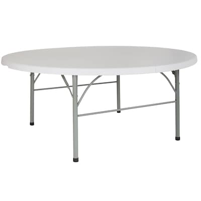 Say hello to the perfect solution for your seating crisis! The bi-fold round dining folding table is a great option for special event planners, catering companies and banquet facilities. This durable, easy to clean table is commercial rated for use in banquet halls, convention centers and at trade shows. Use during game night, dress it up for holiday parties, and coordinate crafts night. The granite white tabletop is 6' in diameter, 2" thick, and will comfortably seat up to 8 adults. Its waterproof, impact and stain resistant top have a 771 pound static load capacity. Attractive gray powder coated legs lock securely in place while in use and non-marring floor caps protect your floor by sliding smoothly when you need to move the table. The table folds in half, making it easy to store and transport, using the convenient carrying handle attached on the side. When using for outdoor events store indoors to protect the frame from extreme moisture.