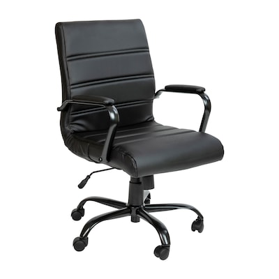 Toss out that old and boring office chair that you've had for years because it's time for an upgrade with this sleek mid-back LeatherSoft office chair. Upholstered in soft and durable LeatherSoft upholstery and paired with a black base help construct this modern office chair. Designed with your comfort in mind, this ergonomic desk chair features ample padding to get you through an 8-hour workday. With its adjustable features, you can lean back while you take a quick phone call or lock in an upright position when it's time to focus. The knob located underneath the seat adjusts the force needed to recline. Improve the look at your desk or work area with this stylish Mid-Back Black LeatherSoft Office Chair with Black Base that is highlighted by attractive horizontal line stitching. A pressure-reducing waterfall front edge seat and armrest pads round out the look and comfort of this chair.