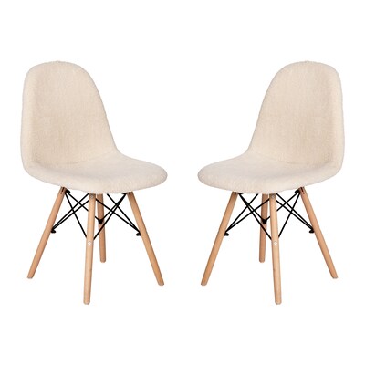 Brighten any room in your home with the unique look of this set of 2 faux sherpa upholstered scoop chairs. Whether you're moving into a new home or just want to give your current space an updated look, this cozy padded lounge chair is a perfect choice. The universal faux shearling covering effortlessly blends in any decor from rustic to industrial. Although this armless chair will add textural appeal to your space, it is also strong and durable. The steel frame and solid beechwood legs will provide a worry-free sitting experience in front of your vanity, in the living room, dining room, or bedroom. The armless design allows easy entry from multiple angles and gives a more open look to any room. Assembly is simple and takes less than 10 minutes for quick setup. Clean stains or spills with a damp cloth to maintain the look of your chair.