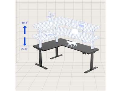 The FlexiSpot E7 is an L-shaped height-adjustable desk with black base and top. Powered by three motors, the desk can support up to 330 lbs. and travel at 1.5" per second. Holeless columns are not just attractive, but also prevent the buildup of grease on the moving stages. The anti-collision feature reverses the direction of the desk if an object is struck during movement.