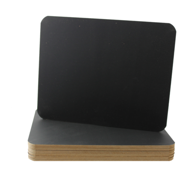 The black chalkboards provide a sturdy, reusable writing surface, ideal for classrooms, offices, or home use. Perfect for teaching, brainstorming, or note-taking, they offer a sleek, professional look while being easy to clean and reuse. The dark surface ensures clear visibility for writing and drawing, making them an essential tool for any educational or creative space. This set delivers both practicality and sustainability in one package. (Pack of 12)