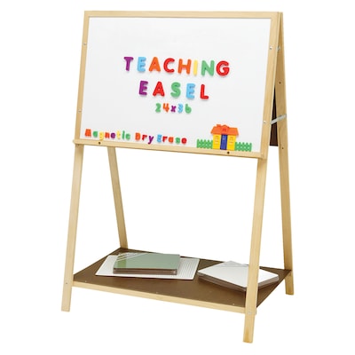 The Teaching Easel is our largest easel features a magnetic dry-erase surface mounted horizontally, making group activities easier. Surface measures 35" W x 22" H and is adjustable to two different heights. Reverse side comes with a standard masonite surface for attaching charts and writing pads. Includes two full length trays for supplies and a large 21D" x 36W" bottom storage shelf. Measures 54" H x 36" W.
