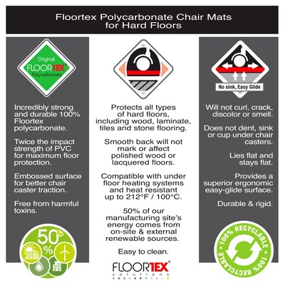 These high clarity chair mats for hard flooring are made from Floortex Original polycarbonate, which has double the impact strength of PVC and will not crack, curl, discolor or smell. The perfectly flat and hard surface provides easy glide movement of caster based chairs which can reduce leg fatigue and lower back strain. Ultimat is environmentally safe, free from Phthalates, PVC and toxic chemicals. An ideal choice for people with allergies. Eco-friendly manufacturing with 50% of our manufacturing site’s energy coming from on-site and external renewable sources. 100% recyclable. Our polycarbonate mats lie perfectly flat from delivery and can be used immediately.