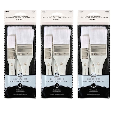 Add this universal brush set to your collection of acrylic paint brushes for all those large projects. Each paint brush has a natural wood handle and white nylon bristles - perfect for all your arts and crafts! These superior-quality paint brushes can be used on everything from home decor projects to smaller paper crafts. Make the Plaid White Nylon Chip Paint Brush Set an essential part of your art supplies for a reliable finish every time. Each set includes 3 brushes. Sold as 3 sets for a total of 9 brushes.