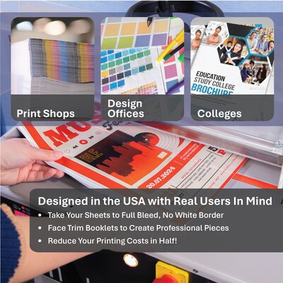 • Electric stack cutter effortlessly cuts sheets up to 16.9" wide and up to 400 sheets per stack