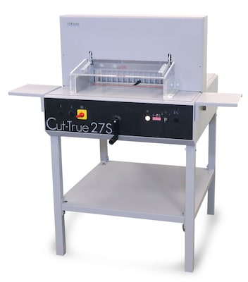 The Formax Cut-True 27S Semi-Automatic Electric Paper Cutter delivers precise cutting for paper stacks up to 18.9” wide and 3.15” high. Its user-friendly design includes dual-button electronic operation, an automatic paper clamp, and an LED digital readout. This semi-automatic cutter also comes with a rugged metal stand for stability and a convenient shelf for storage. These features, combined with the bright red LED Cutting Line, allow operators to make fine adjustments and see exactly where the blade will cut. Accuracy meets safety in the Cut-True 27S with front and rear transparent safety guards, a blade lock, a safety lock with key, external blade depth adjustment, an easy-to-use blade change safety tool, and a wooden paper push for safe alignment. Ideal for brochures, invitations, and more, the Cut-True 27S is perfect for print shops and in-plant finishing operations, providing crisp, accurate cuts.
