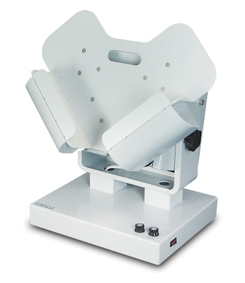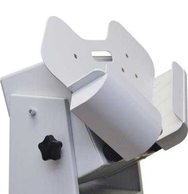 Save time by aligning, drying and reducing static all at once. The compact, powerful Formax FD 402TA1 paper jogger is ideal for jogging a variety of paper sizes up to 12” x 18”. Three operating modes along with variable vibration speed and air pressure controls combine to reduce jogging time, allowing press sheets and digital printouts to be air-dried immediately. Its high capacity V-shaped jog bin holds up to 940 sheets and allows for jogging a criss-cross stacked pile of papers, while the vertical to horizontal tilt feature keeps large paper stacks from bending.