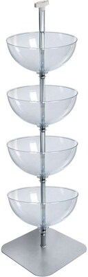 Four-Tiered Bowl Floor Display with Flat Base. These 16" bowls are made of high quality clear polycarbonate (Lexan) that can sustain high impact and offers a crystal clear finish. Overall height is 60"