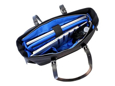 The Francine WIB Slim Liberator black carrying case is a functional, zippered notebook tote that is suitable for the woman. It has micro-fiber/faux leather trim exterior with nylon interior for added durability. This lightweight, washable carrying case features padded laptop compartment, zipper closure and padded handle. It supports device with screen size up to 14.1". It offers ample storage space for your professional and personal needs.