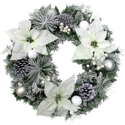 - Accented with white poinsettia blooms, shatterproof ornaments and pinecones