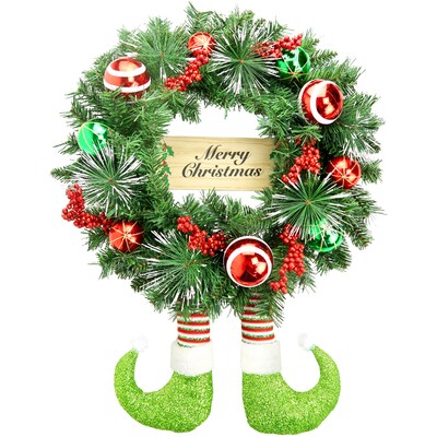 Spruce up your holiday decor with a 24-inch round artificial wreath from Fraser Hill Farm. This lovely wreath brings all the realistic detail of a live wreath with timeless elegance that lasts year after year. Made with flame-retardant and non-allergenic materials, this Christmas classic is the perfect alternative to the real thing. Lifelike pine needles are accented with multicolored shatterproof ornaments and artificial red berries scattered throughout the branches while silly elf boots stick out the bottom. A Merry Christmas sign completes the look and wishes everyone who passes by a cheerful message. This wreath comes fully assembled so all you need to do is pull it out of the box, fluff the branches, and hang wherever you choose with very low maintenance required from year to year. This beautiful wreath radiates a festive spirit, whether you're decking the halls indoors or covered outdoors. Hang your new wreath on the door, on the wall, or above the fireplace mantle, and welcome each guest with holiday cheer that will last from one season to the next.