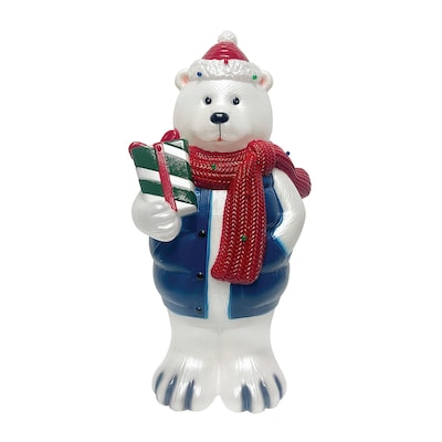 Add a frosty dose of fun to your seasonal setup with the Fraser Hill Farm 30” Polar Bear Blow Mold. Equipped with a blue vest and cozy red scarf, this cheerful polar bear is ready to charm the whole family and bathe your home in a cheerful glow. Set it up on your porch or beside your fireplace for a touch of whimsy and wonder. Illuminated with 8 multicolor LED lights, this blow mold brings a festive radiance to indoor or outdoor spaces. This Christmas blow mold is built to last with weather-resistant polypropylene plastic and designed to retain its quality for many seasons to come. Its playful expression and festive styling make it an instant favorite for winter décor and invites you to celebrate the joyful side of the holidays. Whether you're dressing up your lawn for a holiday party or curating a magical winter wonderland indoors, this blow mold brings warmth, charm, and Christmas cheer. Pair him with other classic figures or let him shine on his own; either way, he’s sure to become a beloved part of your holiday tradition. Make your cold nights a little warmer and memories a little sweeter with Fraser Hill Farm.