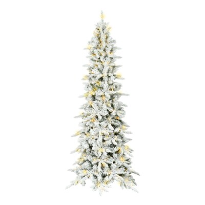 Embrace the spirit of the season with the Fraser Hill Farm 6.5-Ft Mountain Pine Flocked Artificial Slim Christmas Tree with Dual Multicolor LED Lights. Perfect for smaller spaces or as a stylish accent tree, this slender beauty features realistic branches flocked with snow to bring the peaceful look of a winter forest indoors. Pre-lit with white and multicolor LED lights, it casts a cozy glow that instantly makes your home feel festive, welcoming, and ready for celebration. Crafted from high-quality materials for long-lasting use, this artificial tree eliminates the mess of fallen needles and the hassle of untangling string lights. Assembly is quick and easy with its hinged branch design, and it stores away just as smoothly at season’s end. Whether you keep the look minimal or decorate it from top to bottom, the slim profile is perfect for showcasing ornaments without overwhelming your space. It’s an ideal choice for apartments, entryways, or rooms that need a touch of holiday cheer. For a complete winter wonderland, pair it with matching wreaths, garlands, and other coordinating pieces from Fraser Hill Farm’s Mountain Pine collection.