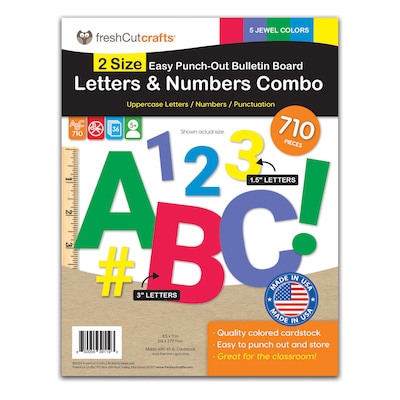 Get our two most popular letter sizes in one pack with FreshCut Crafts Letters & Numbers Jewel Combo Pack! More sizes mean maximum creativity to make eye-catching, colorful bulletin board designs, posters, and displays. You'll get bright, multicolored, easy alphabet punch-out uppercase letters, numbers, symbols, and punctuation in two popular sizes — 3-inch and 1.5-inch. Colors include rich red, yellow, green, blue, and purple. SO MANY LETTERS! This 36-sheet pack includes 209 3-inch and 501 1.5-inch letters for a total of 710 pieces in all, made from color-rich, fade-proof quality card stock that offers 2-sided versatility and tons of creative possibilities.