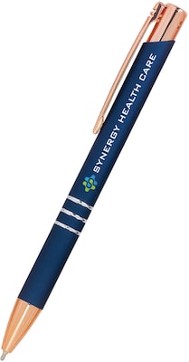 - Metal pen with rose gold accents on the clip and tip. Triple decorative silver rings.