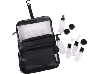 - Includes one hanging travel bag and 11 bottles for toiletries