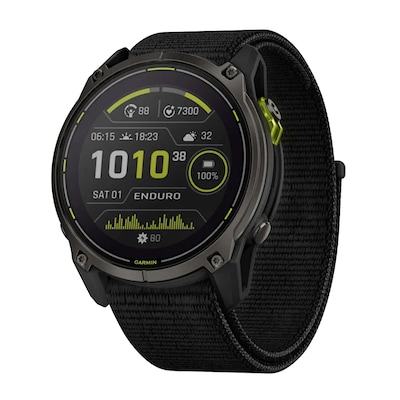 You're built to push limits — so is the Garmin® Enduro™ 3. This ultra-performance 51-mm GPS smartwatch features a lightweight design and incredible battery life with solar charging that lasts up to 320 hours in GPS mode (assumes continuous use for entire period in 50,000 lux conditions). Light up the dark with the built-in LED flashlight, and enjoy long-distance comfort, thanks to a lightweight black UltraFit nylon band.