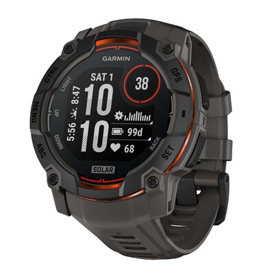 The Garmin Instinct 3 is the rugged 50-mm GPS smartwatch with a 1.1-in. display, built-in flashlight, and unlimited battery life in smartwatch mode with solar charging (assumes all-day wear with 3 hours per day outside in 50,000-lux conditions). With bolted construction, a metal-reinforced bezel, and scratch-resistant lens, it can take on your toughest adventures. It's engineered to MIL-STD-810 standards for thermal and shock resistance and is also 10 ATM water-rated. To keep you on track, the Instinct 3 smartwatch includes a built-in 3-axis compass and barometric altimeter. Plus, multi-band GPS with SatIQ technology delivers superior positioning while also optimizing battery life. Its 24/7 health and wellness features keep you connected to your body with heart rate tracking, advanced sleep monitoring, Pulse Ox, and more (this is not a medical device, and data presented is intended to be a close estimation of metrics tracked; Pulse Ox not available in all countries). Instinct 3 also includes Garmin Pay contactless payments (with a supported bank).