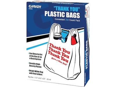 Durable white plastic shopping bags with a friendly “Thank You” message and convenient handles.
