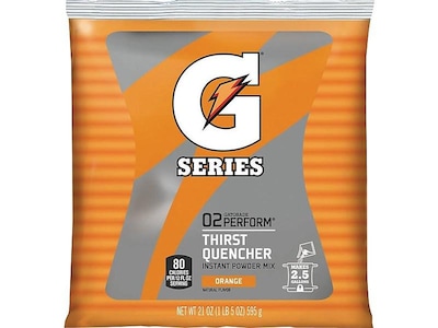 Keep a generous supply of replenishing carbohydrates and electrolytes on hand with this carton of energy drink powder. The orange-flavored mix comes in 32 bags that yield up to 2.5 gallons each of drink for convenience and multiple servings, which is perfect for teams and other groups. This Gatorade energy drink has been formulated to help speed fluid absorption, regulate blood sugar levels and replace electrolytes lost in strenuous activity.