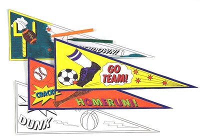 Geeperz™ Team pride Pennants craft kit includes precut and heavy white indeX stock. Craft kit features siX each of four preprinted themes of baseball, basketball, football or soccer, sold as 24 per pack.