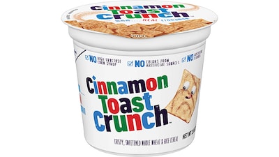 Start the day with a sweet crunch by popping open one of these 2-ounce cups of General Mills Cinnamon Toast Crunch breakfast cereal.