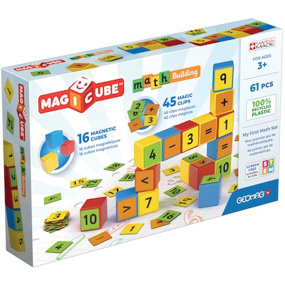 Watch your toddler learn and begin to understand numbers, symbols and build their first mathematical equations. Children will also have the ability to build different shapes, color combinations and 3D structures using Geomag Magicube Math Building 61 pieces that are uniquely designed to connect on all sides and made with 100% recycled plastic. This set contains 16 magnetic blocks and 45 non-magnetic clips. STEM.org authenticated, Magicubes help in the development of creativity, fine motor skills in addition to stimulating imaginative play and curiosity through the science of magnetic construction. Includes 16 magnetic blocks in green, blue, red and yellow, and 45 magiclips (not magnetic) that stick to the magnetic Magicube.