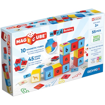Watch your toddler learn and begin to distinguish letters, build their first words and match to an image. Children will also have the ability to build different shapes, color combinations and 3D structures using Geomag Magicube Word Building 55 pieces that are uniquely designed to connect on all sides and made with 100% recycled plastic. This set contains 10 magnetic blocks and 45 non-magnetic clips. STEM.org authenticated, Magicubes help in the development of creativity, fine motor skills in addition to stimulating imaginative play and curiosity through the science of magnetic construction. Includes 10 magnetic blocks in green, blue, red and yellow, and 45 magiclips (not magnetic) that stick to the magnetic Magicube.