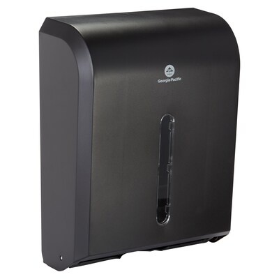 Burnish the image of your office or establishment with this Georgia-Pacific combi-fold Vista c-fold or multifold dispenser. Featuring a handsome design and a black finish to complement a wide array of interiors, this dispenser comes with a translucent cover that provides a tasteful level of discreteness while making it easy to find out when you are about to run out of towels.