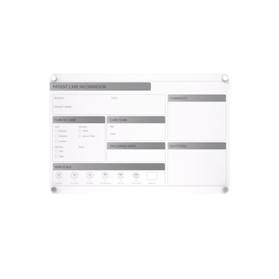 Ghent's Slide Changeable Patient Room Glassboards are the perfect communication tool for patient care in any healthcare environment. The interchangeable patient communication board comes with a sleek and easy to disinfect glass surface and a changeable, double-sided patient information graphic insert, that can slide to the left or right, to switch between English and Spanish for versatility for effective engagement between patients and care providers. With the look of permanent graphics, the interchangeable insert makes the board flexible, perfect for the ever-changing healthcare environment. Hospital communication boards are a great option for patient rooms to engage in effective communication between nurses, doctors and patients. Patient room boards can help improve HCAHPS and patient satisfaction scores for your hospital. They allow you to showcase different care plans or multiple languages with a removable insert that is easily replaced if branding or initiatives change. Ghent changeable patient room glassboard featured 1/4" tempered safety glass with radius corners and tamper-resistant standoffs. Glassboards are ideal for healthcare as they withstand high-use and do not ghost or stain, ensuring sensitive patient information is not left behind. Patient room boards are shipped to you in Ghent's worry-free packaging, designed specifically for shipping glassboards.