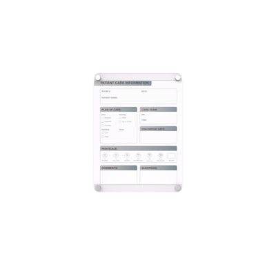 Ghent's Slide Changeable Patient Room Glassboards are the perfect communication tool for patient care in any healthcare environment. The interchangeable patient communication board comes with a sleek and easy to disinfect glass surface and a changeable, double-sided patient information graphic insert, that can slide to the left or right, to switch between English and Spanish for versatility for effective engagement between patients and care providers. With the look of permanent graphics, the interchangeable insert makes the board flexible, perfect for the ever-changing healthcare environment. Hospital communication boards are a great option for patient rooms to engage in effective communication between nurses, doctors and patients. Patient room boards can help improve HCAHPS and patient satisfaction scores for your hospital. They allow you to showcase different care plans or multiple languages with a removable insert that is easily replaced if branding or initiatives change. Ghent changeable patient room glassboard featured ¼" tempered safety glass with radius corners and tamper-resistant standoffs. Glassboards are ideal for healthcare as they withstand high-use and do not ghost or stain, ensuring sensitive patient information is not left behind. Patient room boards are shipped to you in Ghent's worry-free packaging, designed specifically for shipping glassboards.