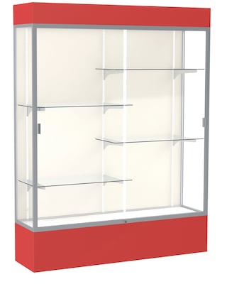 Ghent Spirit Lighted Floor Case, 60"W x 80"H x 16"D, Plaque Back, Satin Finish, Red Base and Top (3175PB-SN-RD)