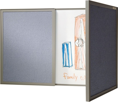 - Opens to a 72" of dry-erase surface, unit closes to a 36" fabric bulletin board
