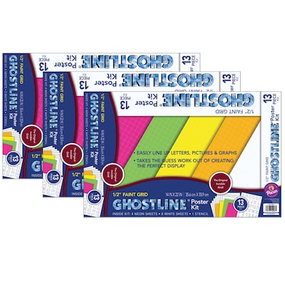 This Ghostline® Poster Board Kit contains everything you need to create professional looking posters, charts or displays. Each set includes eight sheets of White poster board, four sheets of neon poster board (Neon Yellow, Neon Orange, Neon Green and Neon Pink), plus a 2" stencil sheet that includes letters, numbers and symbols. Sold as 3 sets for a total of 39 pieces.
