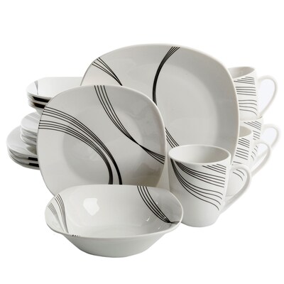 This Gibson Curvation 16-Piece Soft Square Dinnerware set is decorated with a bold, modern black linear design on a white background. The rounded square shape complements the modern motif. This quality fine china will enhance your table while it gives you long lasting beauty. This Curvation set is perfect for everyday or special occasion dining.Includes: Four 10.5 inch Dinner Plates, Four 8 inch Dessert/Salad Plates, Four 7.75 inch Bowls, Four 12 ounce Mugs.