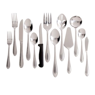 Set includes * 8 each: - salad fork, - dinner fork, - dinner knife, - dinner spoon, - teaspoon, - steak knifes, * 1 each - serving fork, - serving spoon, - slotted serving spoon butter knife, - sugar shell, - ladle, - cake server* 18/0 stainless steel* Guage: 1.8/1-1/2-mm* Semi-polished* Dishwasher safe
