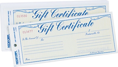 - Gift certificates with envelopes includes consecutive numbering, screened backgrounds and signature lines to enhance security