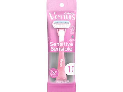 The Gillette Venus Sensitive female razor blade is designed with a woman's body in mind. The razor is made for women with sensitive skin. This razor features three curve-hugging blades for a shave with up to 0% irritation, and cuts hair closer to the skin for a shave that keeps your skin protected. Designed with a soft-grip gel handle and three blades for a close and comfortable shave.