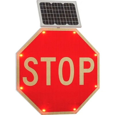 With eight bright LEDs and highly-reflective tape, the Global Industrial™ Solar Flashing LED Stop Sign is designed to draw drivers' attention at night and in dimly lit areas without the need for running electrical connections from the grid. Made from aluminum for corrosion- & weather-resistance and durability, this unit features an integrated, adjustable 13W solar charging panel and a lithium-ion battery that will run for up to seven days on a full charge. It features a highly-visible red background, large lettering, and bright blinking LEDs that provide visibility up to 2600 feet, making it ideal for use in high-incident areas. UL-listed. Meets MUTCD standards.