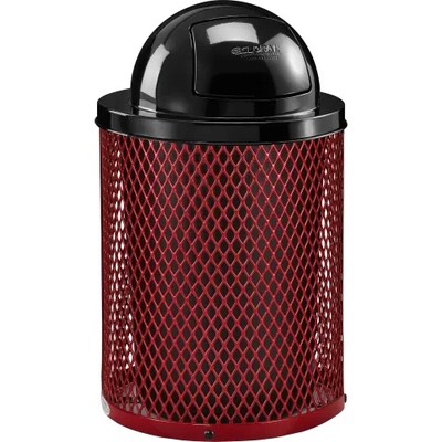 The round 36-gallon Global Industrial™ Outdoor Diamond-Steel Trash Can with Domed Lid gives you high capacity for rubbish with design and construction details that provide resistance to the elements, graffiti, and vandalism. The lid & base are made of steel and treated with a corrosion-resistant red powder coat finish and the expanded metal steel sides have a glossy red fade- & corrosion-resistant thermoplastic coating that will hold up against harsh summer and winter weather. The trash can features a domed lid outfitted with a self-closing door that hides waste from view and keeps out rain & snow, while allowing easy access to dispose of trash. The lid is secured to the frame with a cable to prevent loss or theft. A removeable interior plastic liner that holds the trash or provides a way to install and hold a trash bag is also included.