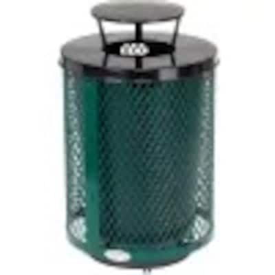 The round 36-gallon Global Industrial™ Outdoor Diamond-Steel Trash Can with Rain Bonnet & Base gives you high capacity for rubbish with design and construction details that provide resistance to the elements, graffiti, and vandalism. A receptacle base raises the container 3" off the ground and has leveling feet to provide better stability on rough or uneven surfaces. The lid, frame & base are made of steel and treated with a corrosion-resistant green powder coat finish and the expanded metal steel sides have a green fade- & corrosion-resistant thermoplastic coating that will hold up against harsh summer and winter weather.