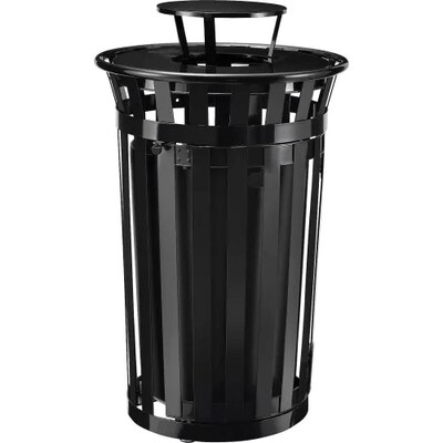 Global Industrial Outdoor Slatted Steel Trash Can w/ Access Door & Rain Bonnet Lid, 36 Gallon, Black (261941BK)
