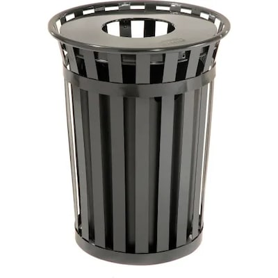 The round 36-gallon Global Industrial™ Outdoor Steel Slat Recycling Trash Can gives you a large capacity for rubbish with design and construction details that provide resistance to the elements, graffiti, and vandalism. The flat-bar steel slats are fully welded and treated with a corrosion-resistant black polyester powder coat finish that will hold up against harsh summer and winter weather. Included with the trash can is a flat lid with hole for trash that is secured to the frame with a cable to prevent loss or theft, and a removeable interior high-density polyurethane plastic liner that holds the trash or provides a way to install and hold a trash bag.